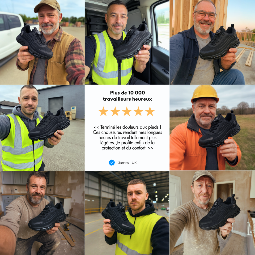 « J’avais toujours le même problème avec mes chaussures de sécu : semelles qui se décollent vite, pieds trempés dès qu’il pleut, et mal de chien après une journée.